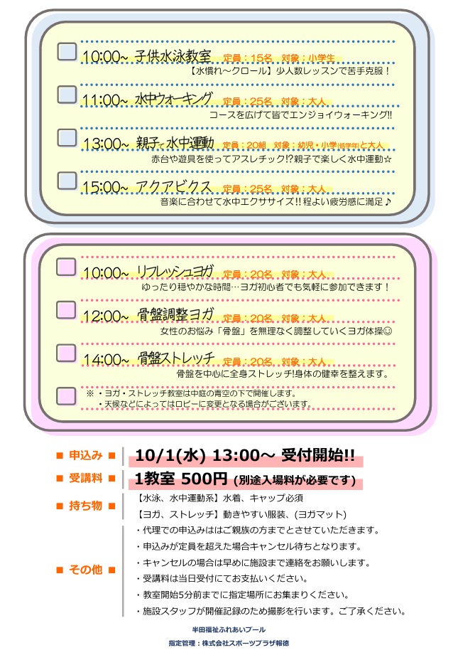 10月13日(月祝)のスポーツの日におきまして、ワンコイン体験教室を開催いたします。